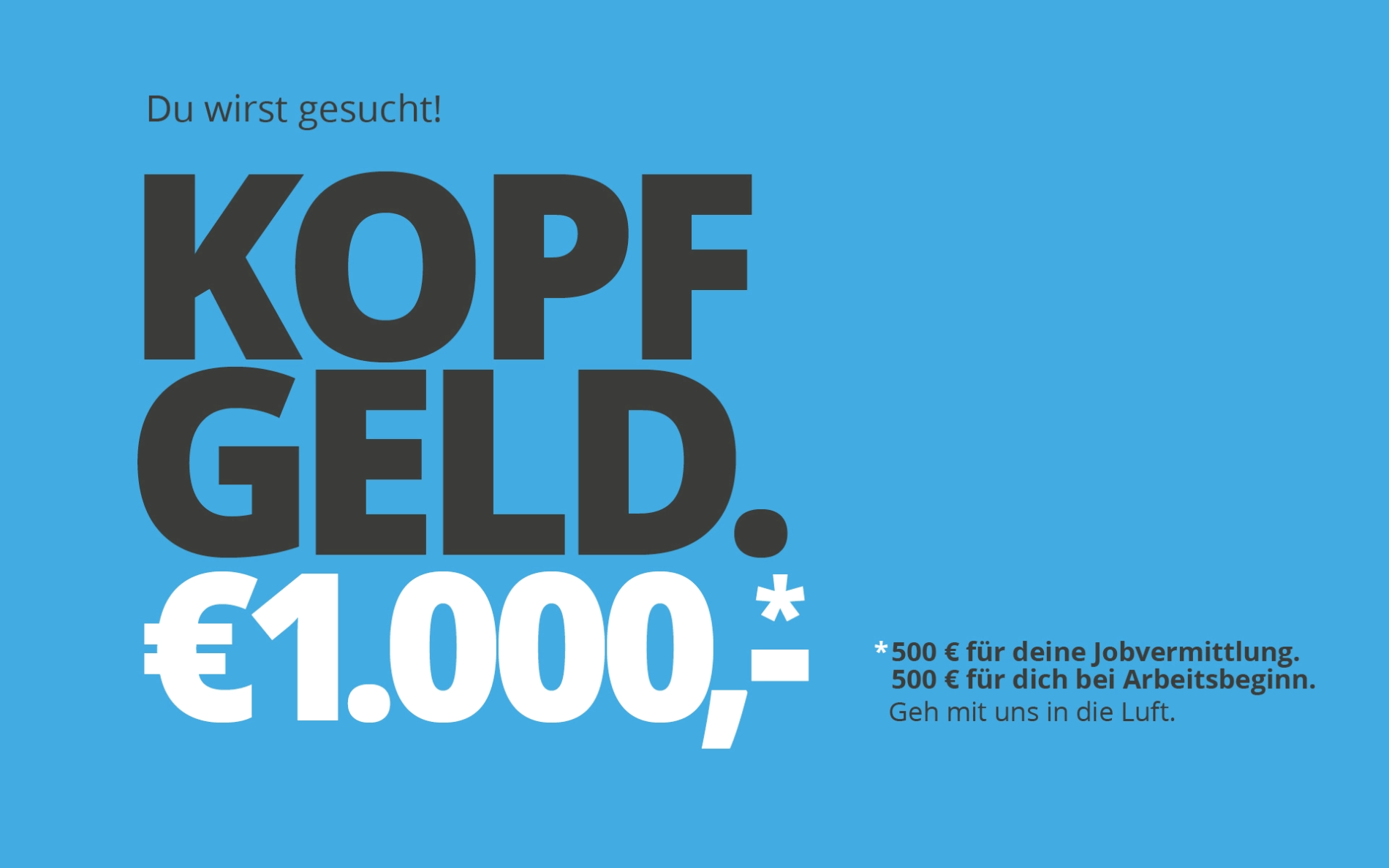 Gehe jetzt mit uns in die Luft und werde Teil unseres Teams oder empfiehl uns einen Spezialisten weiter! 1000 Euro Kopfgeld zu verdienen (500 Euro für deine Jobvermittlung – 500 Euro für dich bei Arbeitsbeginn.)